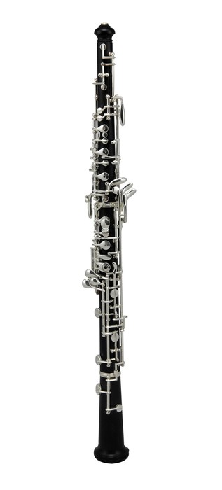 The oboe is a double-reed instrument that plays in the soprano range. They are most commonly made from wood, but student models can be made from resin as well. As opposed to the quite similar-looking clarinet it has a conical bore and the sound is produced through a double bamboo reed instead of a mouthpiece. Because of its distinctive, bright sound and rich timbre, it is often used as a solo instrument in orchestral works.